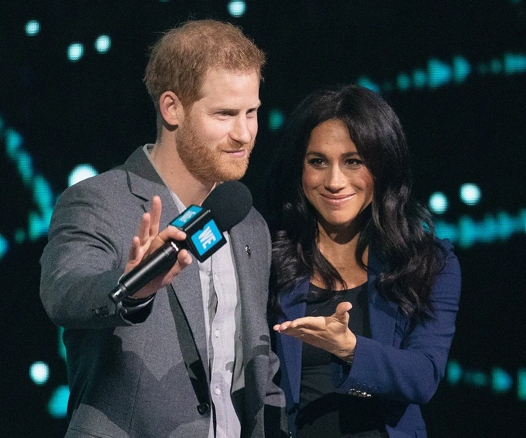 Prince Harry and Meghan, Duchess of Sussex on stage at a 2019 event.