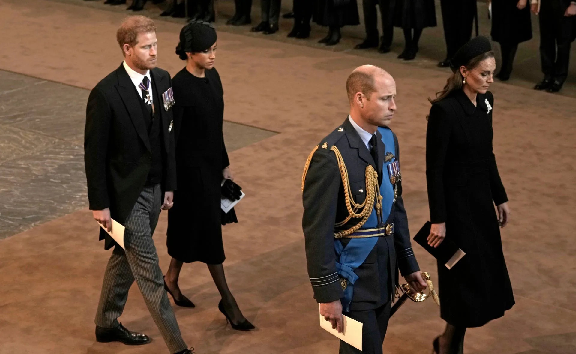 Even in grief, all family feuds are put on hold as Meghan Markle and Prince Harry join fellow members of the British royal family at Buckingham Palace in receiving Queen Elizabeth II’s coffin.