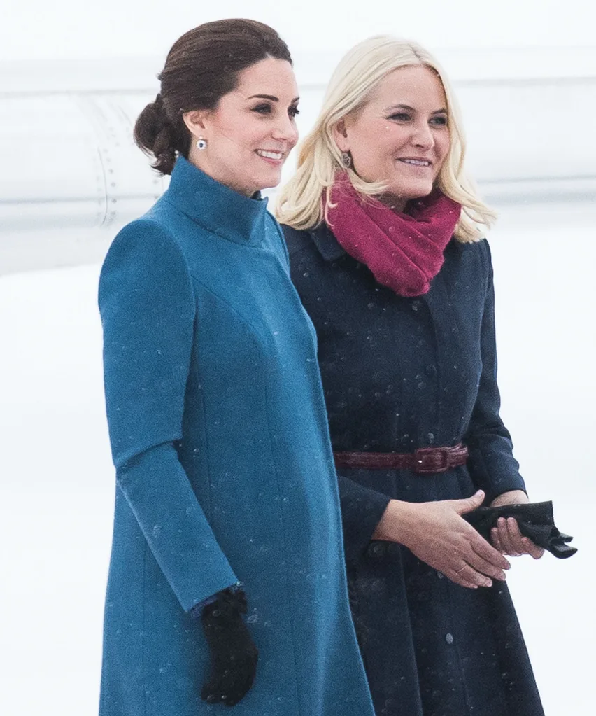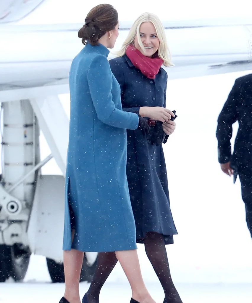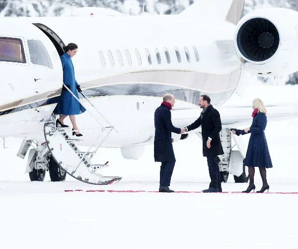 Although delayed due to extreme weather conditions, the Duke and Duchess of Cambridge were greeted by Crown Prince Haakon and Princess Mette-Marit after their private chartered plane landed at a snow-covered air force base near the Norwegian capital — luckily, a sturdy red carpet was rolled out for the royal arrival!
