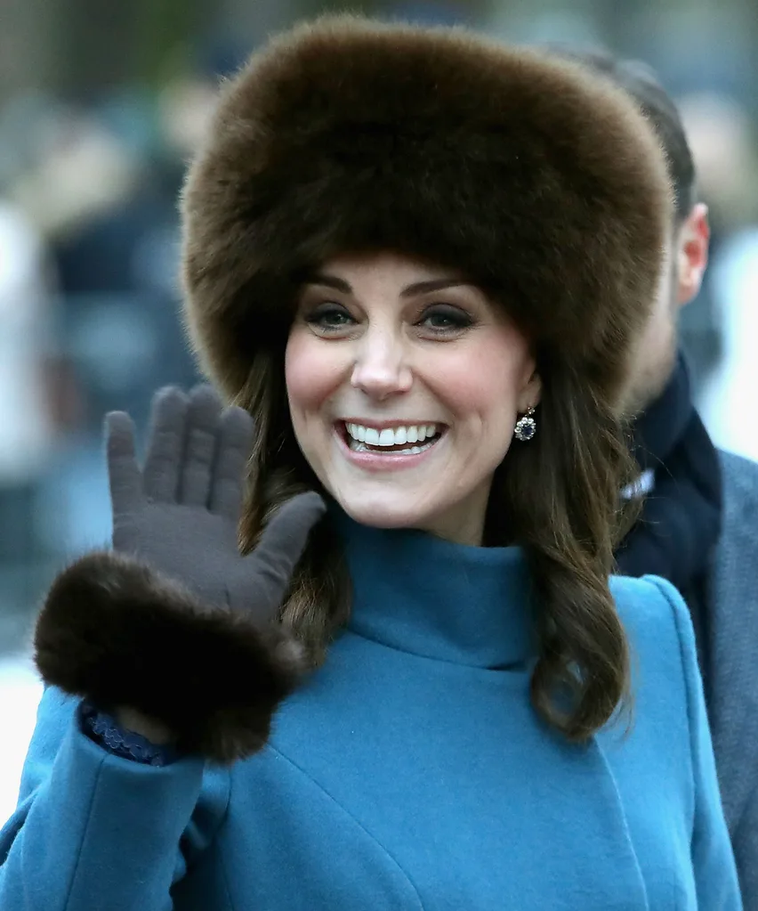 The Duchess was dressed appropriately for the snowy conditions with a cornflower blue coat, a fur hat and matching gloves.