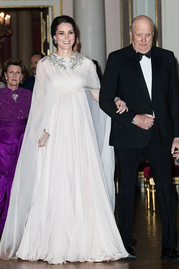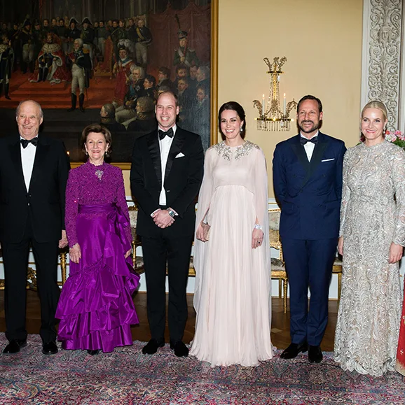 On day three of the Duke and Duchess of Cambridge’s Scandinavia tour the couple stepped out to a glamorous dinner at the Royal Palace in Oslo with their Norwegian counterparts.