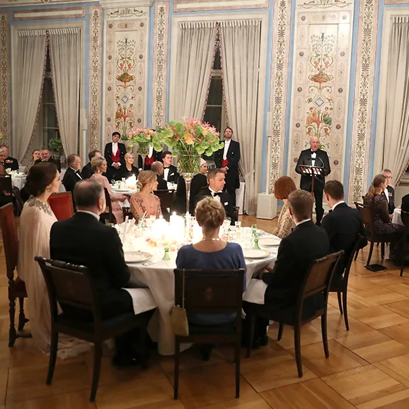 King Harald V of Norway address the esteemed guests at the royal gala.