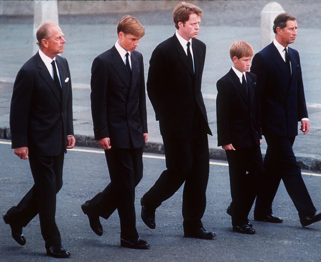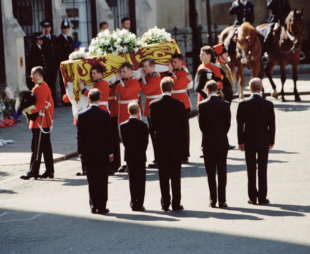 Princes Charles, William, Harry and Phillip follow Princess Diana’s casket, along with Diana’s brother, Charles Spencer.
