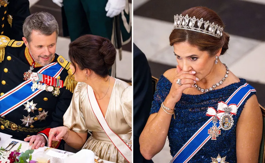 And while Fred, 56, looked in great spirits, raising a glass of champagne to toast the evening and leaning over to whisper into brunette beauty Thordis’ ear, a couple of seats over, his wife Queen Mary, 52, looked uncomfortable and, at times, even teary and upset.