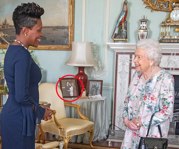 While receiving the High Commissioner for Grenada Lakisha Grant at Buckingham Palace, eagle-eyed royal fans noticed that the Queen had done some rearranging of the photos on the side table.