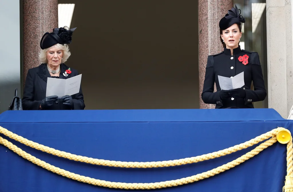 (Getty)At Sunday’s London service, Duchess Catherine and Duchess Camilla stood on the same balcony overlooking The Cenotaph, though socially distanced from one another, as they also paid their respects.