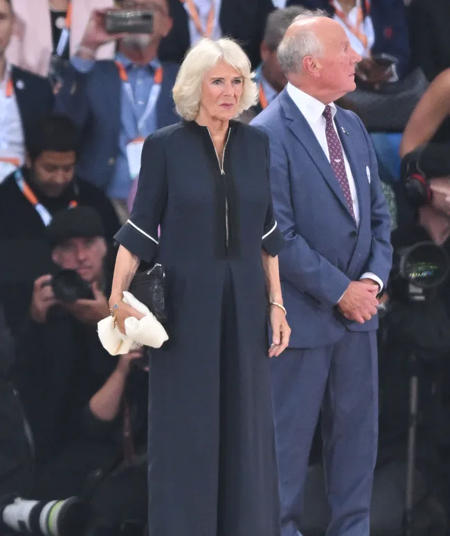 The Duchess of Cornwall opted for a subdued ensemble, choosing a floor-length navy dress with cropped sleeves.