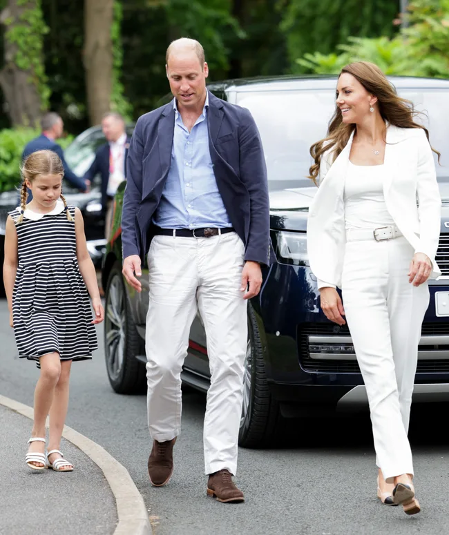 William opted for a white and navy outfit, while Catherine proved once again an all-white suit is the perfect smart casual style, especially when it’s an Alexander McQueen. She was also in her new favourite accessories – two-tone flats.