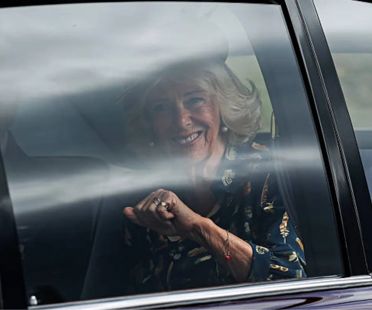 Queen Camilla smiles to the waiting crowd as she arrives at Crathie Kirk Church with King Charles to attend Sunday mass.