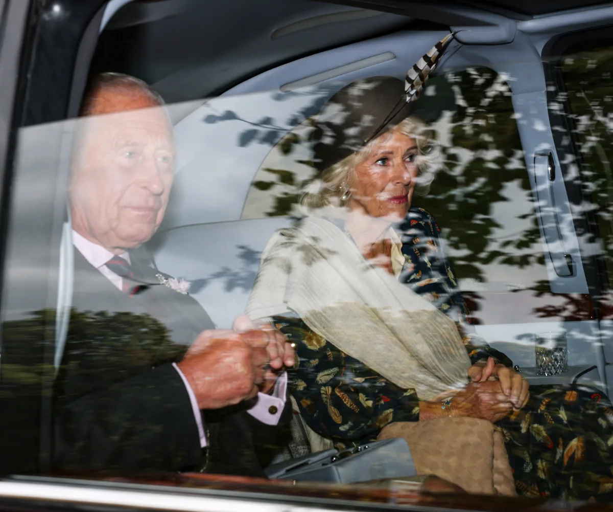 King Charles and Queen Camilla arrive at Sunday mass at Crathie Kirk Church near the Balmoral Estate by car.