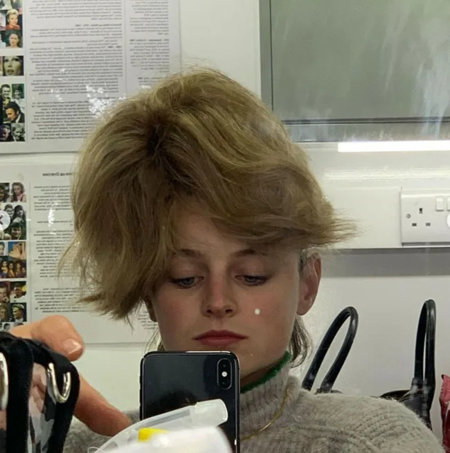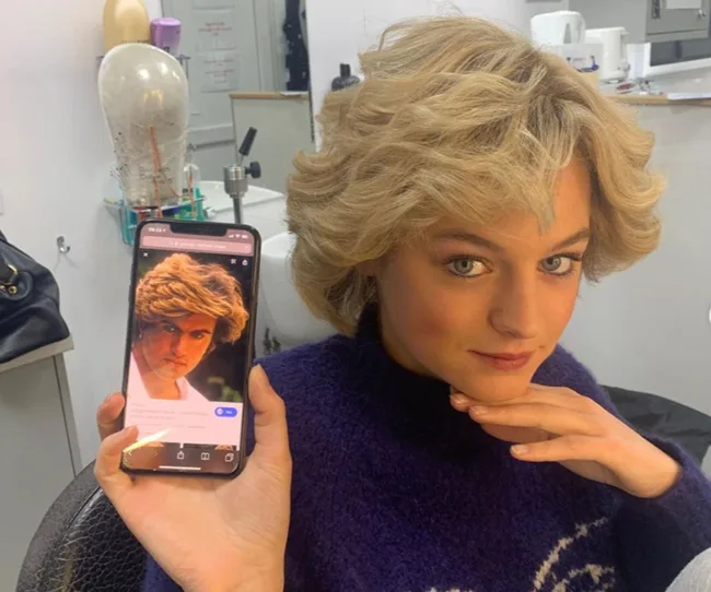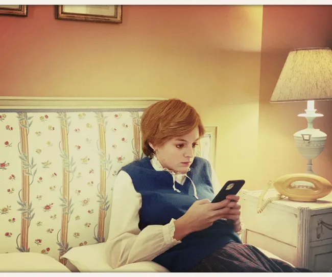 When old school meets new school! "Two phones," director Benjamin Caron captioned this shot of actress Emma Corrin on her iPhone as the '80s style landline can be pictured in the corner.