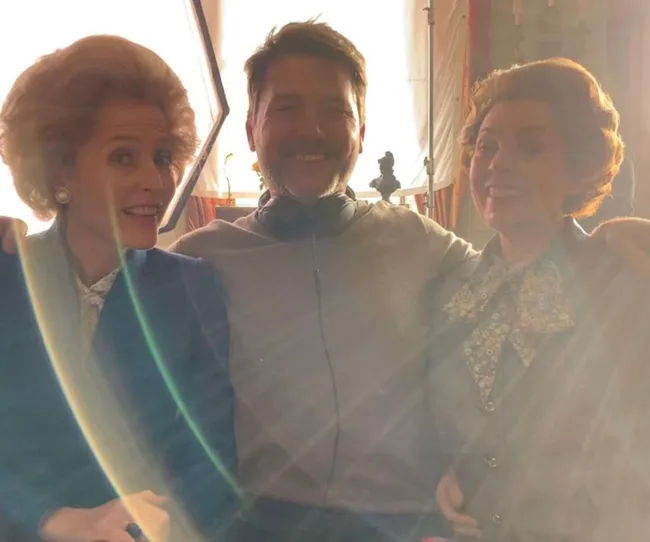 Gillian Anderson, director Benjamin Caron and Olivia Colman share a warm embrace.
