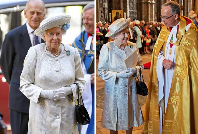 The Queen wore a modest, yet elegant cream coat with a blue sapphire broach and pearls.