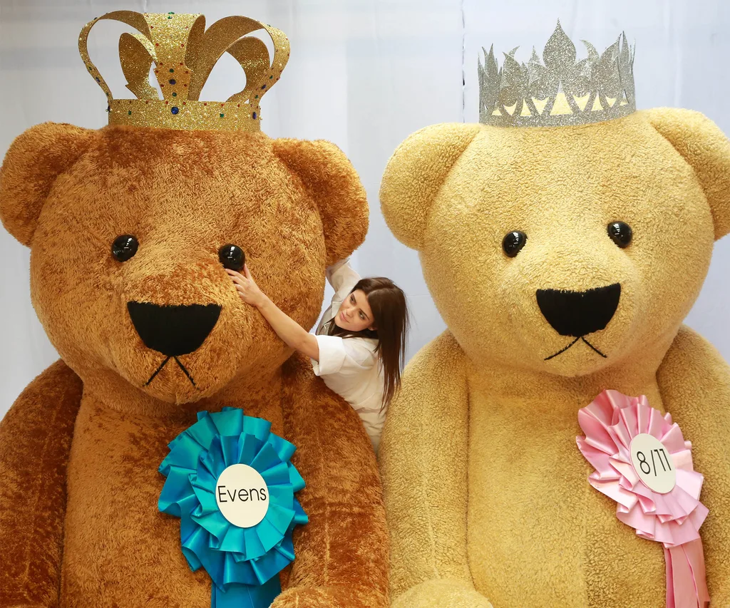 The bears, sent by betting agency William Hill, seemingly represent the new royal addition; one wears a blue ribbon and a crown, and the other a pink ribbon and a tiara. Attached to the ribbons were badges stating the odds of the gender, evens for a boy, 8/11 for a girl.