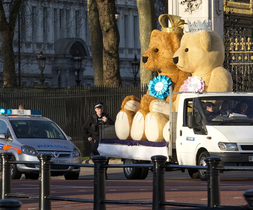 The teddies were dropped off at the gates of Buckingham Palace (of course), after being toured throughout London (including in front of Kate, Will and George’s royal residence, Kensington Palace).