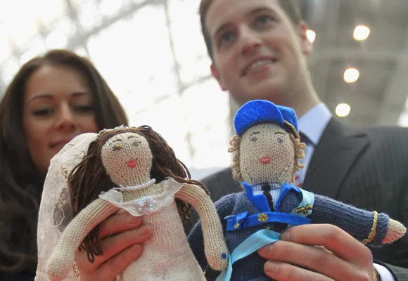 We’re not sure if these dolls will be a hit anywhere else, but they were at the UK toy annual trade show in central London. Prince William and Kate Middleton look-alikes Andy Walker and Kate Bevan hold up the knitted figures of the royal couple.