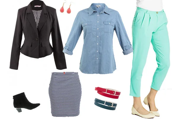 Denim shirt, floral top, striped skirt, jeans, ankle boots, and earrings against white background.