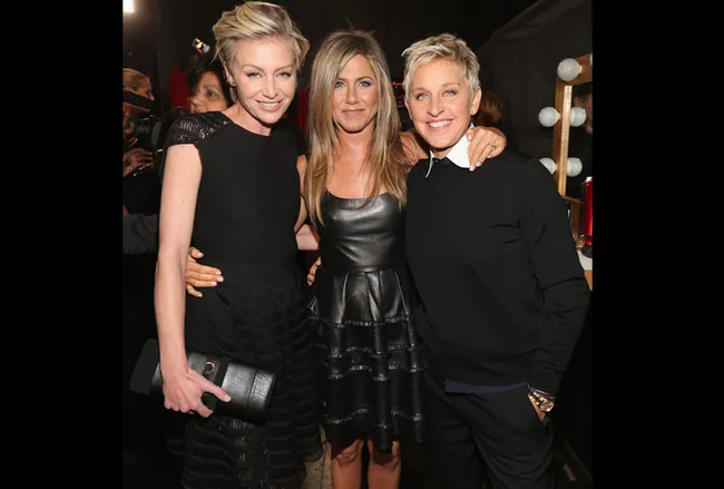 Portia deRossi and Ellen DeGeneres cuddle up to Jennifer Aniston backstage.