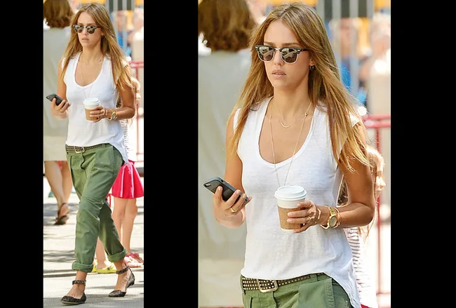 Jessica Alba teams basics with a statement belt.