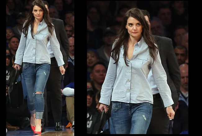 Katie Holmes does double denim and bright heels.