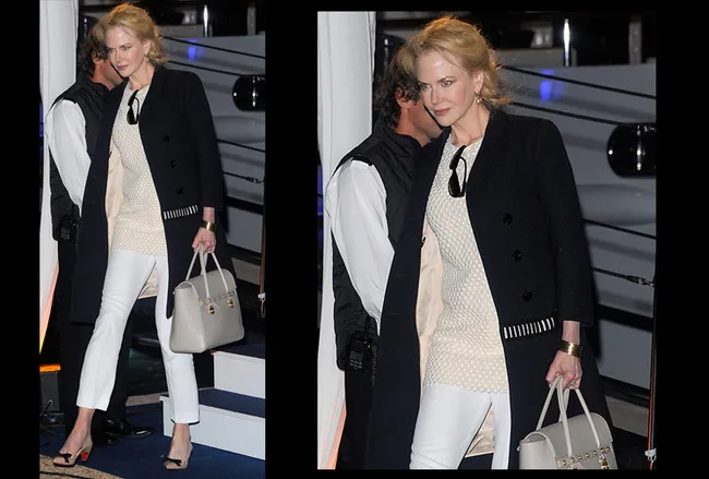 Nicole Kidman teams basic white pants with an elegant bag.